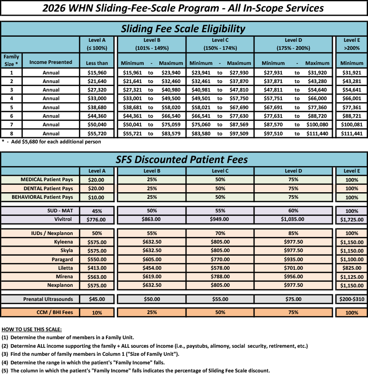 In order to become eligible for the WHN ’s Sliding Fee Discount Program, you must first complete a Sliding Fee Scale application. We encourage you to contact a Financial Counselor listed above at a location nearest to you. For your security, please do not submit SFS documents through the website. Call your health center to schedule an appointment with a Financial Counselor to complete the application process.